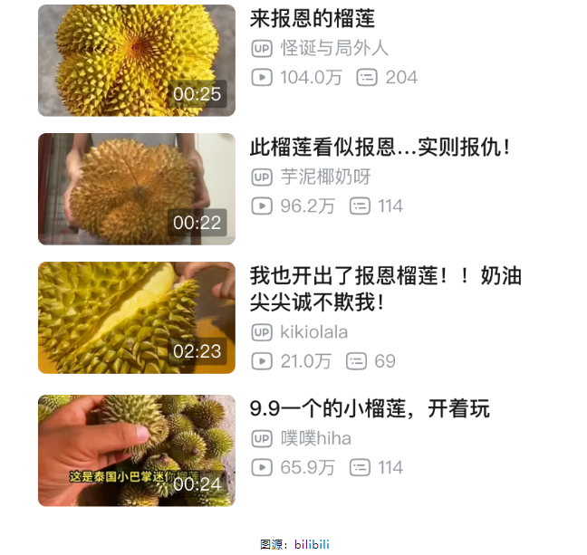 5月份,隨著氣溫升高,榴蓮季來臨,一些社交媒體和短視頻平臺中,“開榴蓮盲盒”相關(guān)的話題和瀏覽量暴漲,開到5房6房肉的榴蓮被稱為“報(bào)恩榴蓮”,開到皮厚肉小的則被戲稱為“榴蓮糖”。這種幽默的調(diào)侃以及沉浸式的剝榴蓮解壓視頻出現(xiàn)跟風(fēng)現(xiàn)象,越來越多的用戶購買榴蓮后,主動(dòng)將開盲盒經(jīng)歷上傳零售平臺及社交媒體,這在一定程度上刺激榴蓮銷量大增。