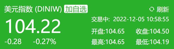 與此同時(shí),5日早間,美元指數(shù)繼續(xù)走跌。截至發(fā)稿,美元指數(shù)報(bào)104.22點(diǎn)。11月,美元指數(shù)已累計(jì)貶值5.03%。