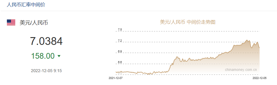 人民幣兌美元匯率中間價(jià)也調(diào)升。外匯交易中心公布數(shù)據(jù)顯示,12月5日,該中間價(jià)報(bào)7.0384元,較前一交易日調(diào)升158個(gè)基點(diǎn)。