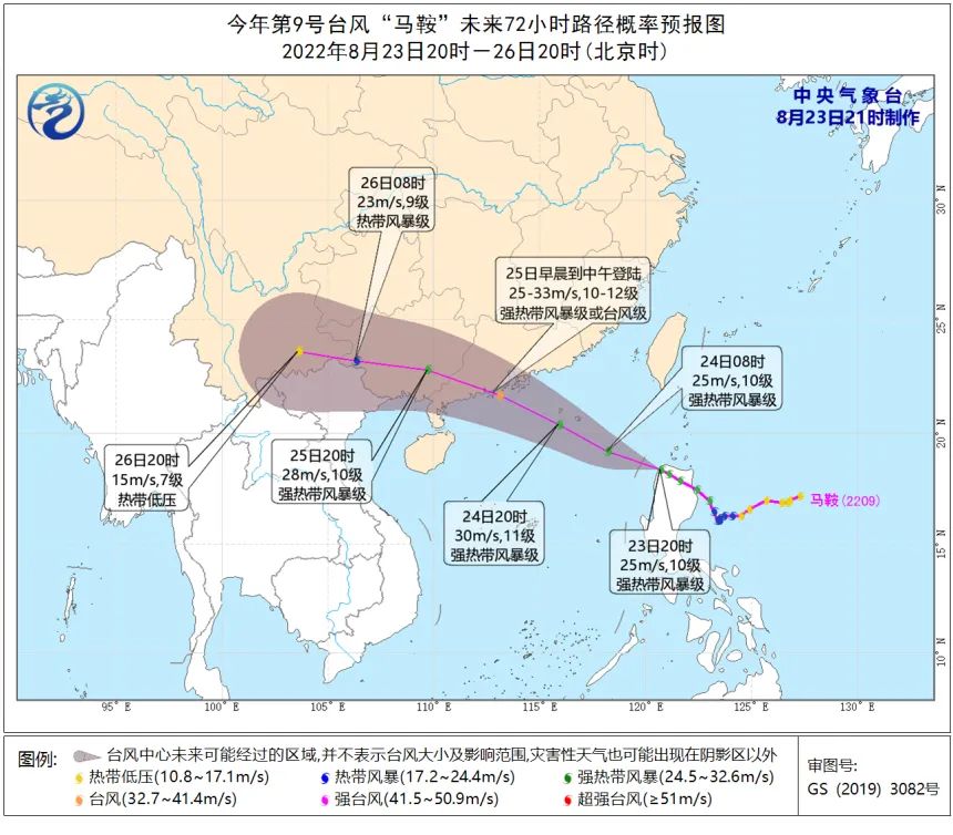 中央氣象臺(tái)8月23日發(fā)布臺(tái)風(fēng)黃色預(yù)警:今年第9號(hào)臺(tái)風(fēng)“馬鞍”(強(qiáng)熱帶風(fēng)暴級(jí))的中心23日20時(shí)位于菲律賓呂宋島境內(nèi),預(yù)計(jì),將以每小時(shí)20-25公里的速度向西北方向移動(dòng),24日凌晨移入南海東北部海面后逐漸向廣東沿海靠近,強(qiáng)度逐漸增強(qiáng),最強(qiáng)可達(dá)強(qiáng)熱帶風(fēng)暴級(jí)或臺(tái)風(fēng)級(jí),并將于25日早晨到中午在廣東惠州至電白一帶沿海登陸(10-12級(jí),強(qiáng)熱帶風(fēng)暴級(jí)或臺(tái)風(fēng)級(jí)),登陸后強(qiáng)度逐漸減弱。
