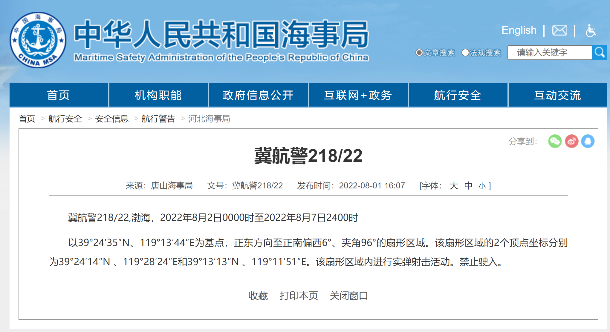 冀航警218/22,渤海,2022年8月2日0000時至2022年8月7日2400時