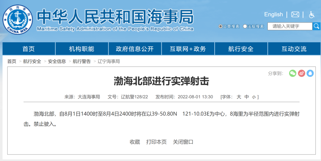 據(jù)中國海事局網(wǎng)站消息,8月1日,唐山海事局、大連海事局、清瀾海事局發(fā)布航行警告,涉及南海海域和渤海部分區(qū)域。