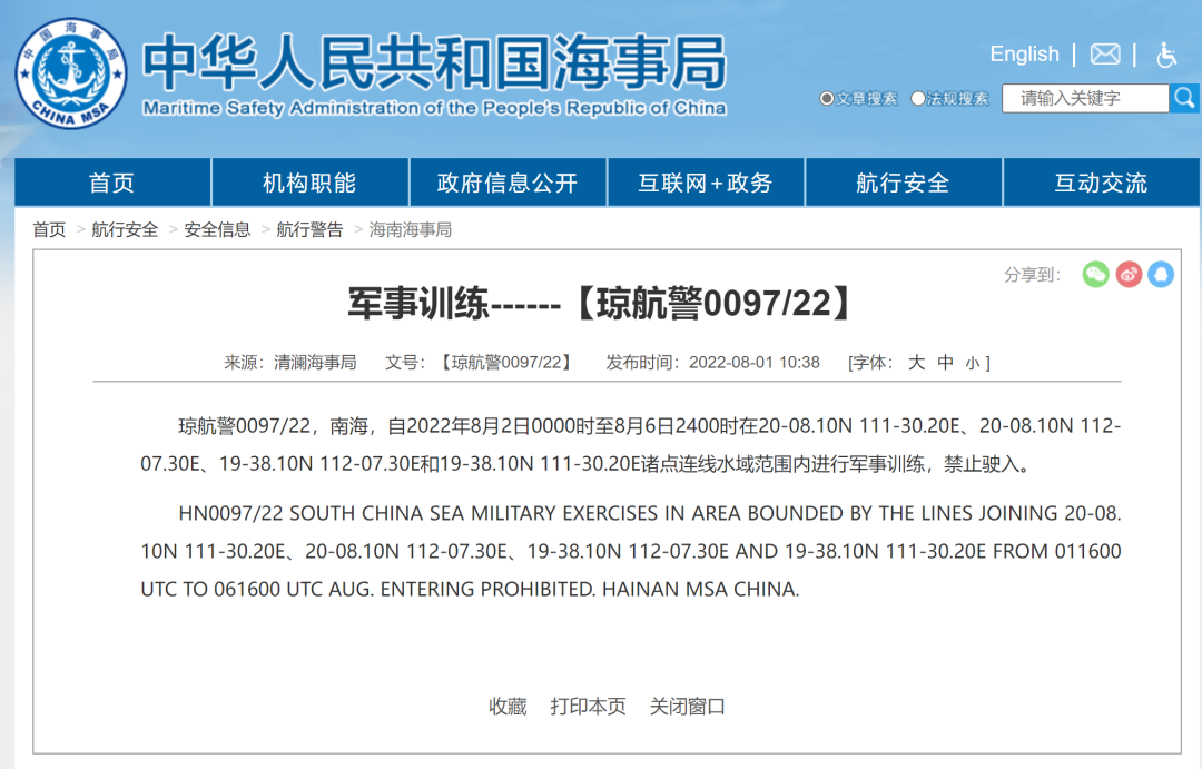 瓊航警0097/22,南海,自2022年8月2日0000時至8月6日2400時在20-08.10N 111-30.20E、20-08.10N 112-07.30E、19-38.10N 112-07.30E和19-38.10N 111-30.20E諸點連線水域范圍內(nèi)進行軍事訓(xùn)練,禁止駛?cè)搿?/strong>