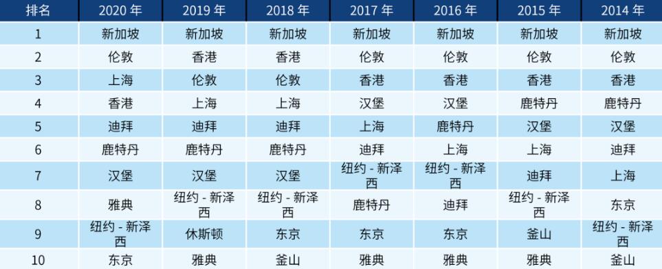 從前十強看,5個位于亞洲,4個位于歐洲,1個位于美洲。新加坡保持領(lǐng)先態(tài)勢,連續(xù)7年奪冠;倫敦憑借高端航運服務(wù)的優(yōu)勢積累,重回次席;上海在航運硬件和軟件建設(shè)上持續(xù)發(fā)力,首次位列三甲;雅典受益于“一帶一路”倡議的帶動作用,排名升至第八位。