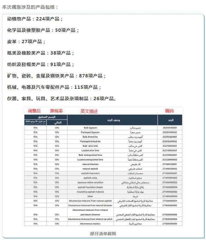 上月,沙特海關(guān)決定自2020年6月10日起提高部分商品的進口關(guān)稅,提高進口關(guān)稅的商品清單涉及2600多個稅則號,涉及較多的產(chǎn)品有家電、汽車行業(yè)等機電產(chǎn)品,以及鋼材等。但該通知發(fā)出后又被暫緩執(zhí)行。根據(jù)最新消息,沙特關(guān)務(wù)署宣布自6月20日起上調(diào)部分產(chǎn)品的進口關(guān)稅,受影響的產(chǎn)品由此前通知中的2600多項減少至1449項,關(guān)稅調(diào)整幅度在0.5%-15%之間。