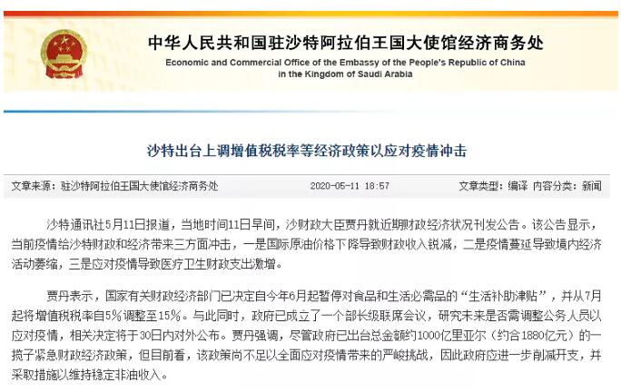 面對新冠疫情危機和其引發(fā)的全球性經(jīng)濟衰退,大多數(shù)國家都推出了擴張性財政刺激計劃,以提振國內(nèi)經(jīng)濟活動。沙特阿拉伯公布了一項計劃,將其增值稅增加三倍,從7月1日開始,將增值稅(VAT)的稅率從5%提高到15%,以增加額外財政收入。高貨值訂單(超過1000里亞爾,約合266.4美金)在沙特阿拉伯清關(guān)時,將產(chǎn)生進口增值稅和關(guān)稅,進口增值稅(VAT)稅金金額按照買家實際支付金額x15%計算,關(guān)稅由海關(guān)根據(jù)不同商品的應(yīng)稅稅率計算。沙特國家統(tǒng)計總局6月30日公布的統(tǒng)計數(shù)據(jù)顯示,沙特第一季度國民生產(chǎn)總值較去年同期下降1%。數(shù)據(jù)顯示,一季度非石油行業(yè)的增長率為1.6%,但石油部門的增長率為-4.6%。
