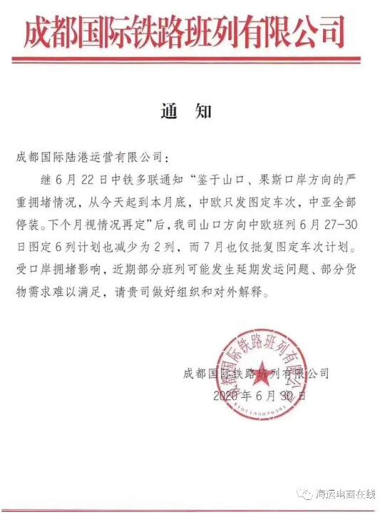 時間剛好過去一個星期,據(jù)悉,中歐班列、中亞班列的發(fā)運情況并沒有好轉(zhuǎn)。6月30日,成都國際鐵路班列有限公司再發(fā)通知,通知中稱鑒于山口、果斯口岸方向的嚴重擁堵情況,從即日起到7月底,中歐只發(fā)圖定車次,中亞全部停裝。何時恢復(fù)正常發(fā)運,下個月視情況再定。其實在6月27-30日期間,山口方向中歐班列,圖定的6列計劃已經(jīng)減少為2列,而且7月份也僅批復(fù)圖定車次計劃。該公司再次聲明受到口岸擁堵的直接影響,近期部分班列可能發(fā)生延期發(fā)運問題、部分貨物的物流需求難以及時滿足,請相關(guān)部門人士做好組織和對外解釋。