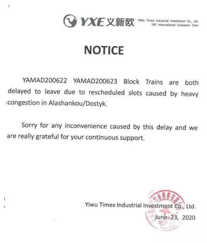 6月24日—6月30日,暫停批復(fù)去程霍爾果斯、阿拉山口方向中歐班列臨時計劃,以及在此期間部分班列延期發(fā)運。