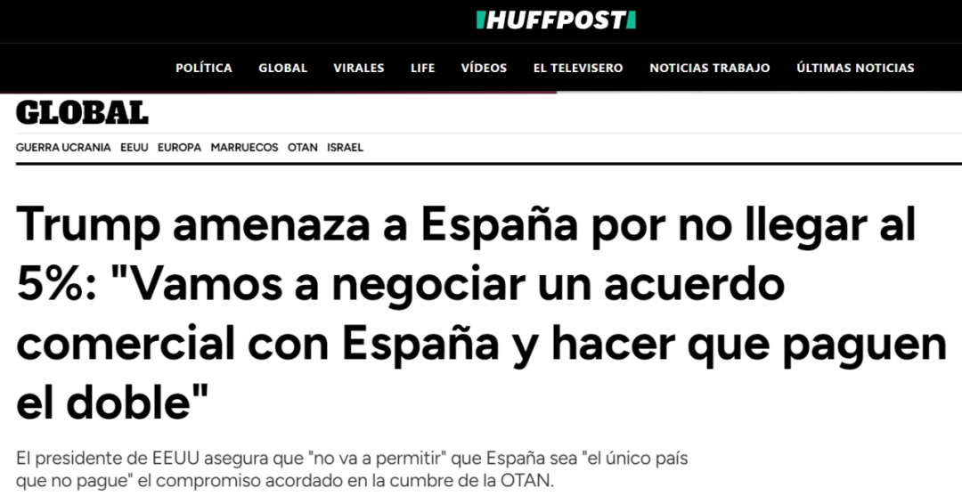 特朗普談及西班牙不愿將國(guó)防支出提高至GDP的5%時(shí)表示:“你們是唯一一個(gè)沒(méi)出錢(qián)的國(guó)家。我不知道你們的問(wèn)題出在哪?!?/span>