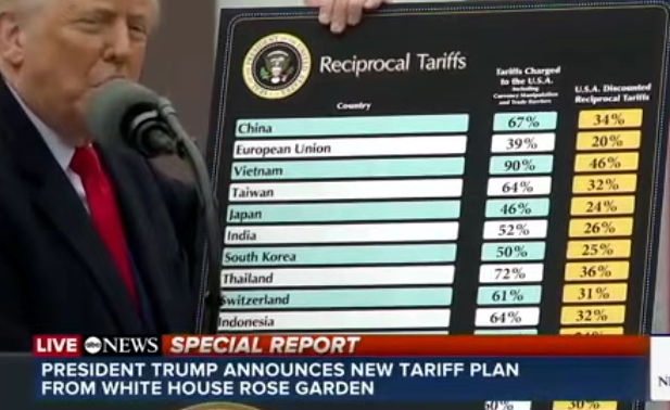 特朗普展示了一張標注“對等關(guān)稅”的大幅表牌,寫有美國計劃對哪些貿(mào)易伙伴征稅以及征多少關(guān)稅。