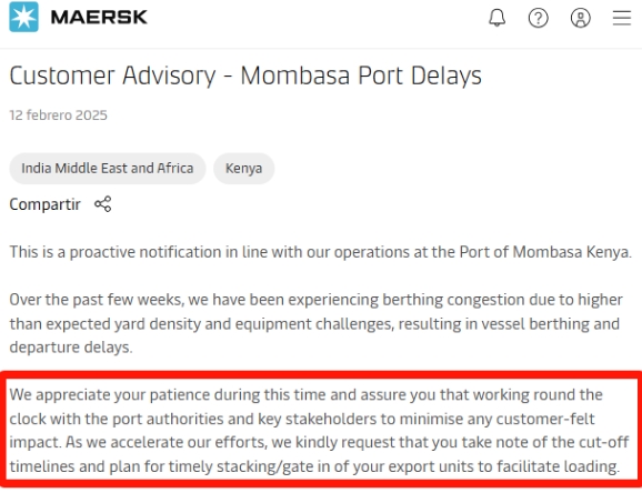 2月12日,航運(yùn)巨頭馬士基再次發(fā)布緊急通知,指出肯尼亞蒙巴薩港正面臨嚴(yán)重的延誤問題。