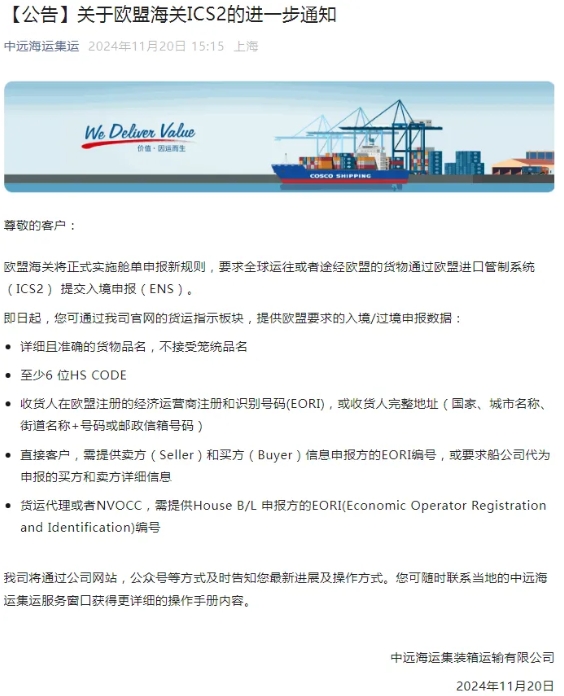 尊敬的客戶(hù):歐盟海關(guān)將正式實(shí)施艙單申報(bào)新規(guī)則,要求全球運(yùn)往或者途經(jīng)歐盟的貨物通過(guò)歐盟進(jìn)口管制系統(tǒng) (ICS2) 提交入境申報(bào)(ENS)。即日起,您可通過(guò)我司官網(wǎng)的貨運(yùn)指示板塊,提供歐盟要求的入境/過(guò)境申報(bào)數(shù)據(jù):