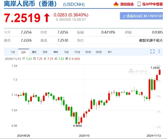 與此同時,在岸人民幣對美元即期匯率11月12日盤中跌破7.22、7.23、7.24關(guān)口,截至12日下午16:32,在岸人民幣對美元匯率最高報7.2401,同樣刷新8月初以來的新低。