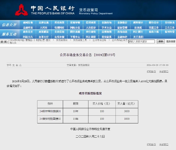 消息面上,2024年8月29日,人民銀行以數(shù)量招標方式進行了公開市場業(yè)務現(xiàn)券買斷交易,從公開市場業(yè)務一級交易商買入4000億元特別國債。