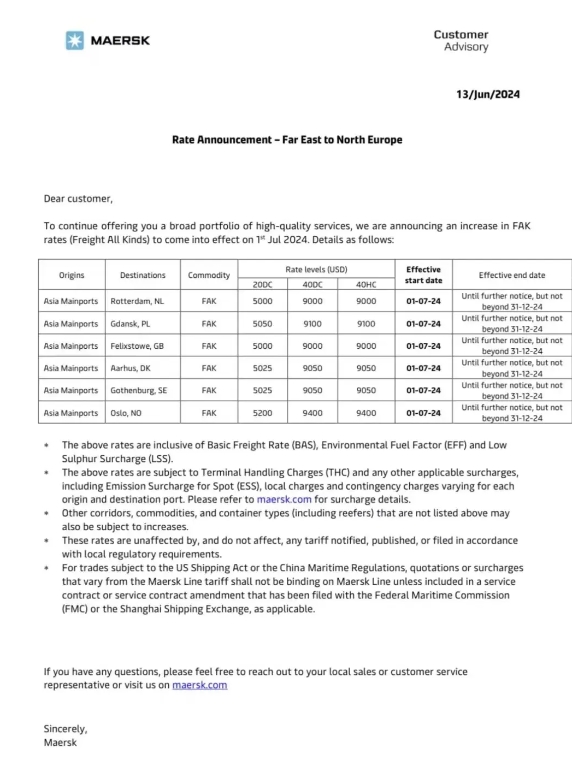 與此同時(shí),海運(yùn)市場(chǎng)繼續(xù)呈現(xiàn)上漲態(tài)勢(shì)。13日,馬士基發(fā)布公告,宣布上調(diào)亞歐航線的FAK費(fèi)率,最高漲至9400美元/FEU,這一調(diào)整將于7月1日正式生效。市場(chǎng)普遍預(yù)期,其他頭部船公司也將紛紛效仿,采取類似的費(fèi)率調(diào)整措施。我們拭目以待,以觀察這一趨勢(shì)的進(jìn)一步發(fā)展。