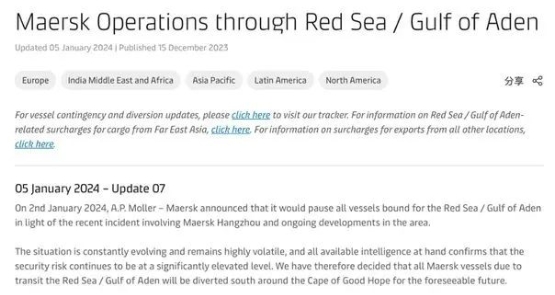 2023年12月30日,“馬士基杭州”輪在從新加坡到埃及蘇伊士港途經(jīng)曼德海峽時遇襲,馬士基當(dāng)時決定在未來48小時暫停經(jīng)過該地區(qū)的航行。