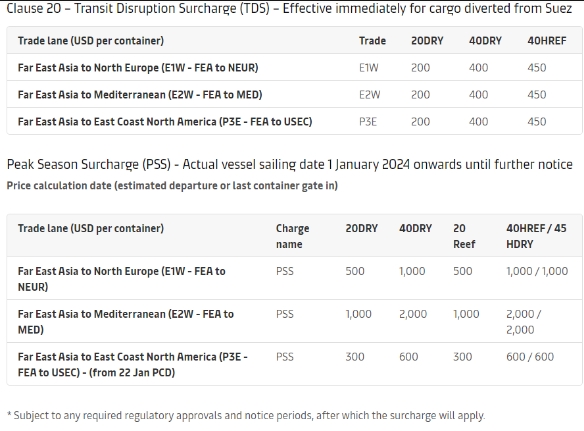 在1月5日的聲明中,馬士基還表示,此前宣布的紅海/亞丁灣地區(qū)受干擾船舶上所有貨物的過境中斷附加費(fèi)(TDS)、旺季附加費(fèi)(PSS)和緊急應(yīng)急附加費(fèi)(ECS)仍然有效。