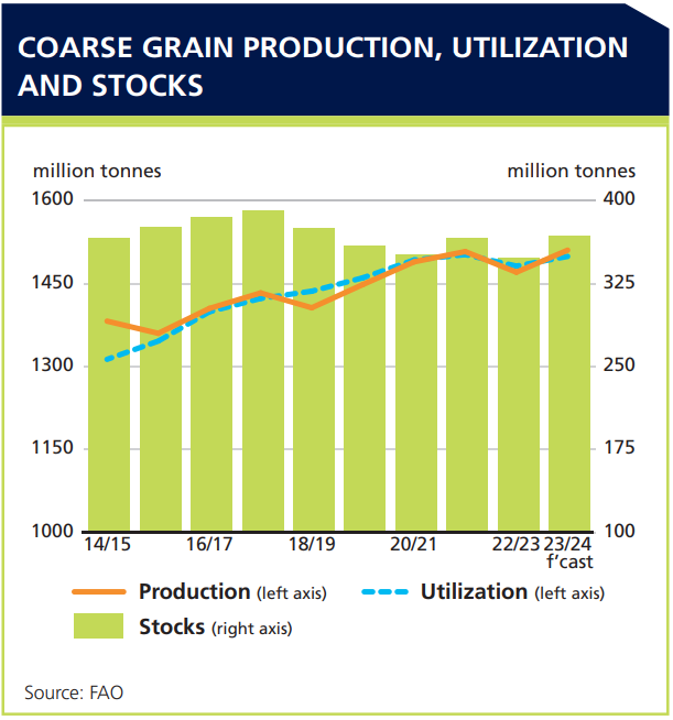 近10年全球粗糧產(chǎn)量、利用量及庫(kù)存量變化圖。?糧農(nóng)組織