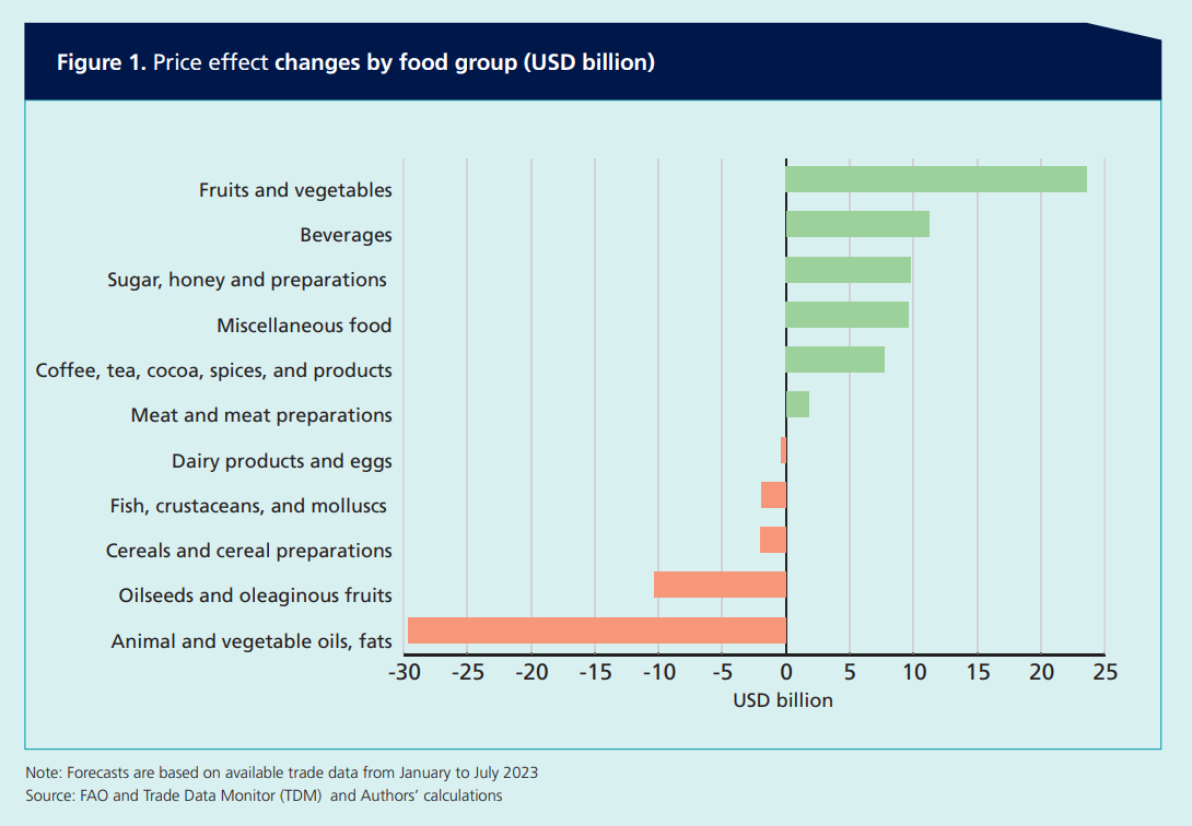 其中,水果、蔬菜以及飲料和食糖對(duì)增量的貢獻(xiàn)顯著,其進(jìn)口量的增長(zhǎng)則主要由高收入和中高收入國(guó)家推動(dòng)。相比之下,低收入國(guó)家的糧食進(jìn)口總額預(yù)計(jì)將減少11%。這些變化往往可以反映世界價(jià)格趨勢(shì):本年度水果、蔬菜和食糖的國(guó)際報(bào)價(jià)猛漲,而動(dòng)物油與植物油的報(bào)價(jià)則有所下降。盡管如此,全球糧食進(jìn)口賬單上進(jìn)口量的變化帶來(lái)的影響預(yù)計(jì)大于價(jià)格變化的影響,不過(guò)咖啡、茶、可可和香料等高價(jià)值或加工產(chǎn)品除外。