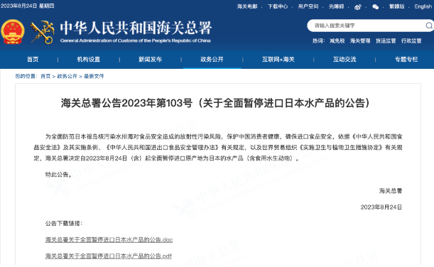 依據(jù)我國法律法規(guī)相關(guān)規(guī)定,以及世界貿(mào)易組織《實施衛(wèi)生與植物衛(wèi)生措施協(xié)定》相關(guān)規(guī)定,海關(guān)總署決定對原產(chǎn)地為日本的水產(chǎn)品采取緊急措施,自2023年8月24日(含)起全面暫停進口原產(chǎn)地為日本的水產(chǎn)品(含食用水生動物)。