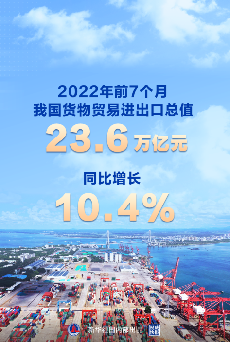 海關(guān)總署8月7日發(fā)布數(shù)據(jù)顯示,2022年前7個(gè)月,我國貨物貿(mào)易進(jìn)出口總值23.6萬億元,同比增長10.4%,其中,7月當(dāng)月,進(jìn)出口同比增長16.6%,延續(xù)了5月份以來外貿(mào)增速持續(xù)回升態(tài)勢,為穩(wěn)定宏觀經(jīng)濟(jì)大盤作出積極貢獻(xiàn)。