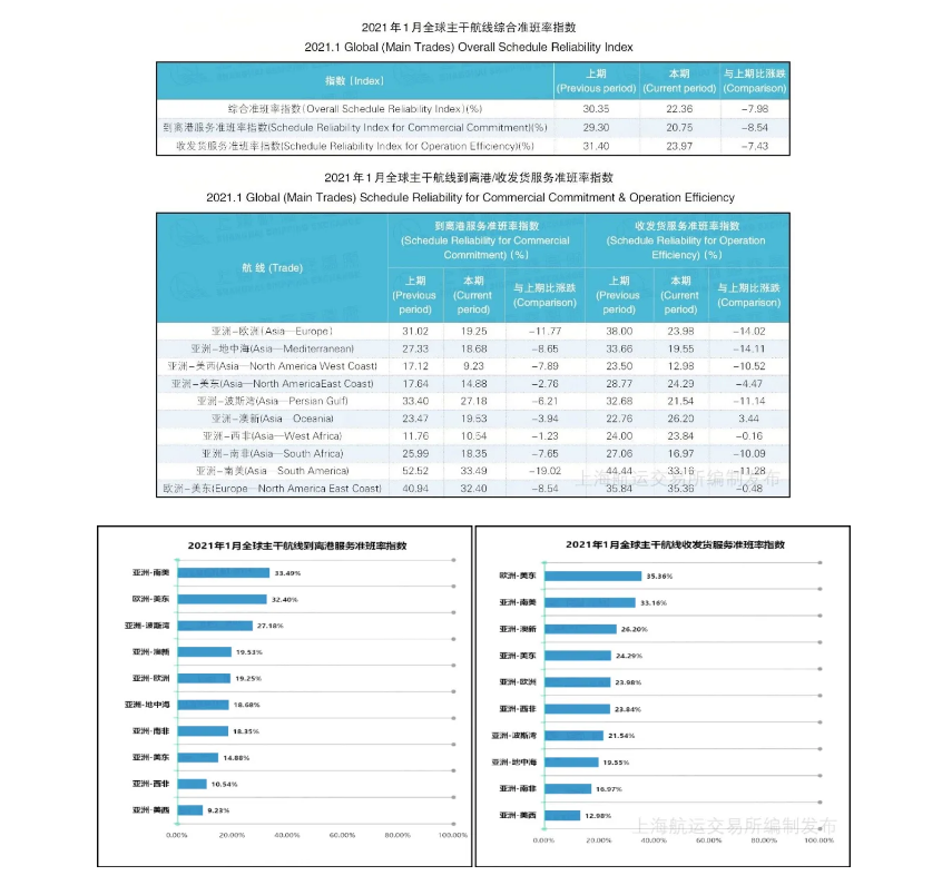 全球主干航線綜合準班率指數繼連續(xù)4個月下降之后,2021年1月繼續(xù)下行,再次刷新自2019年該指數始發(fā)以來的最低紀錄——22.36%,降幅較2020年12月減少7.98個百分點。缺箱嚴重、碼頭擁堵、新冠肺炎疫情嚴峻及法國大規(guī)模罷工等因素是造成班輪準班率指數連創(chuàng)歷史新低的主因。