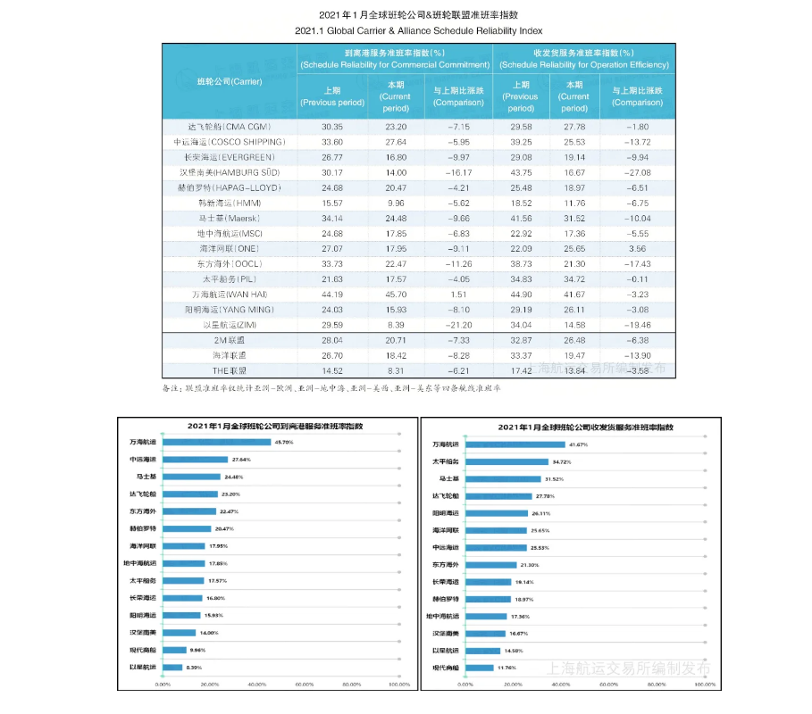 海洋聯盟到離港和收發(fā)貨服務準班率均居第2位,分別為18.42%和19.47%,降幅較2020年12月分別減少8.28個和13.90個百分點。