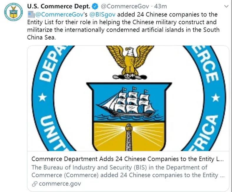 突發(fā)!美國(guó)商務(wù)部網(wǎng)站剛剛發(fā)布一份新聞稿,宣稱將24家中國(guó)企業(yè)列入制裁名單,原因是這些企業(yè)參與在南海修建人工島。