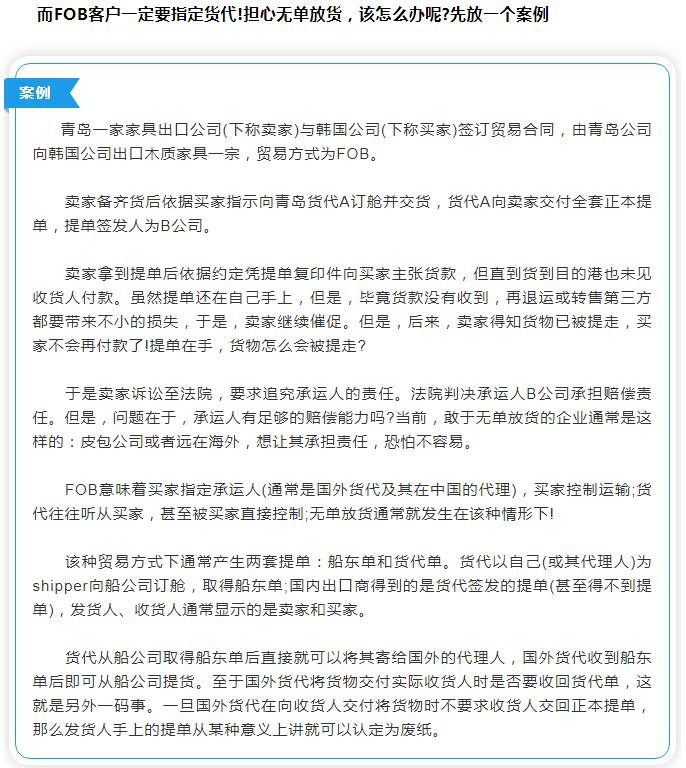 FOB意味著買家指定承運(yùn)人(通常是國外貨代及其在中國的代理),買家控制運(yùn)輸;貨代往往聽從買家,甚至被買家直接控制;無單放貨通常就發(fā)生在該種情形下!