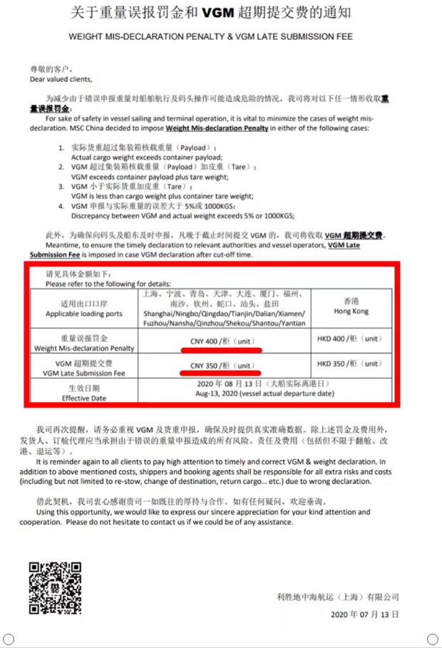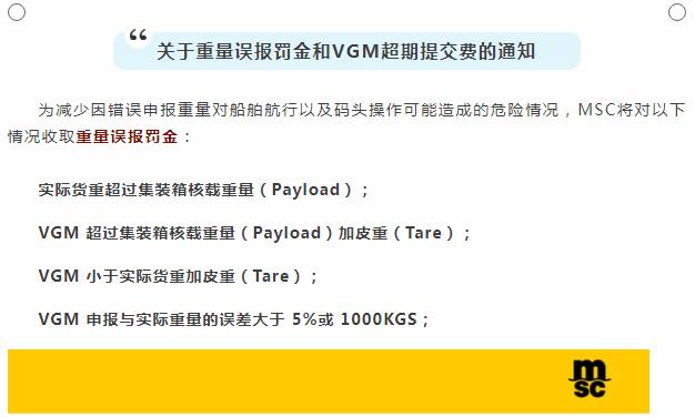 日前MSC發(fā)布通知,為減少因錯誤申報重量對船舶航行以及碼頭操作可能造成的危險情況,將收取重量誤報罰金和VGM超期提交費!最高400元/柜!