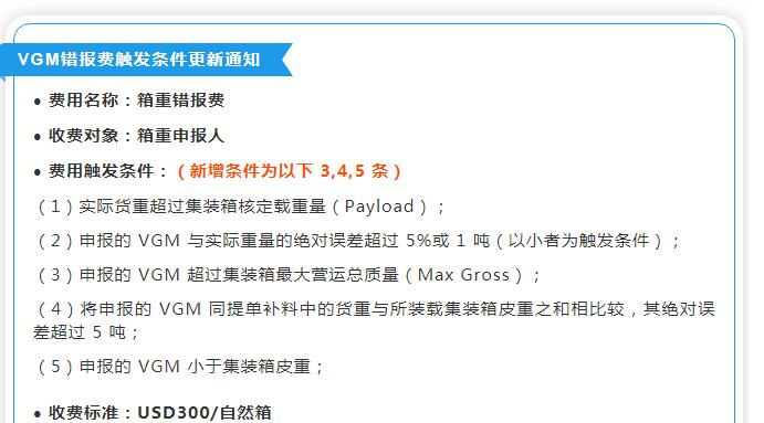 馬士基已發(fā)出通知,VGM錯報、瞞報將收取300美金/自然箱。該費用的觸發(fā)條件將于2020年7月1日(運(yùn)費起算日)進(jìn)行如下更新: