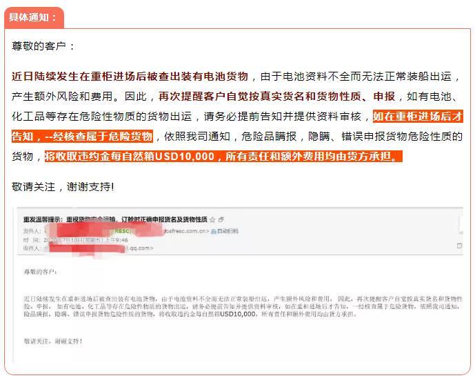 日前有船公司的發(fā)送郵件通知,再次重發(fā)提示:重視貨物安全運(yùn)輸,訂艙時正確申報貨名及貨物性質(zhì)。現(xiàn)在有很多物流公司為了一己私利在沒有任何資料的情況下沖發(fā)純電池產(chǎn)品,導(dǎo)致整柜出不去并面臨高額罰款,這樣不但影響了那條柜里面發(fā)普貨客戶貨物的時效,也影響到了普貨的安全性。這樣做對于那些發(fā)普貨的客戶來說是極其不負(fù)責(zé)的。