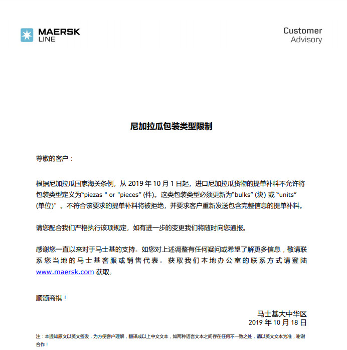根據(jù)尼加拉瓜國家海關(guān)條例,從2019年10月1日起,進(jìn)口尼加拉瓜貨物的提單補(bǔ)料不允許將包裝類型定義為“piezas " or "pieces” (件)。這類包裝類型必須更新為“bulks” (塊) 或 “units”(單位)”。不符合該要求的提單補(bǔ)料將被拒絕,并要求客戶重新發(fā)送包含完整信息的提單補(bǔ)料。