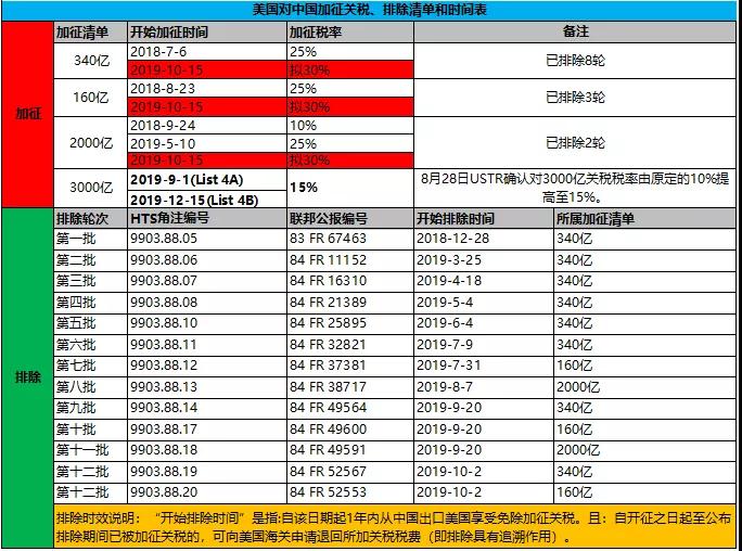 下面我們先來捋一捋對應(yīng)的加征關(guān)稅產(chǎn)品批次和豁免輪次以及對應(yīng)具體執(zhí)行稅率、清單和時間表如下: