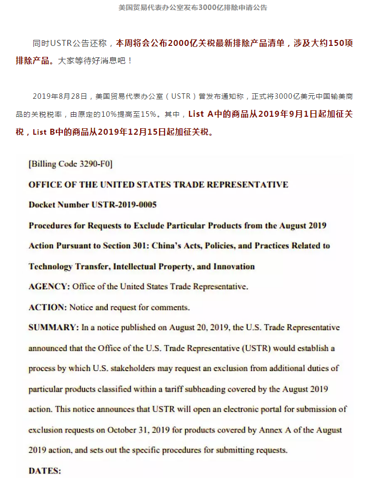 美國啟動對中國3000億美元征稅清單產(chǎn)品啟動排除程序