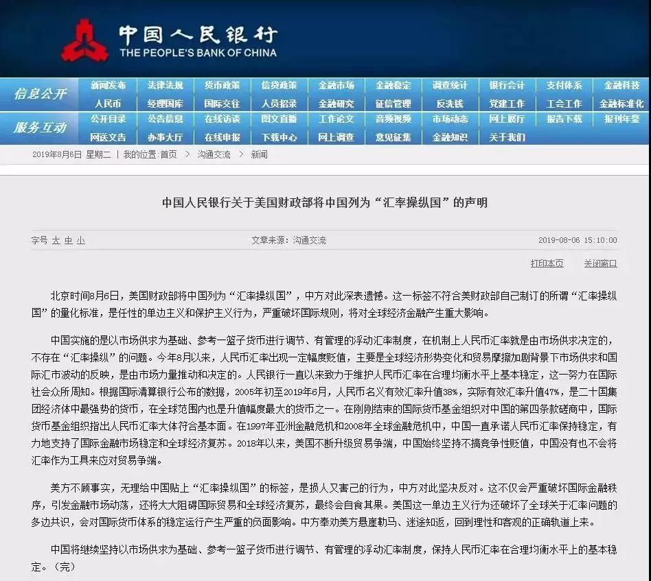 北京時(shí)間8月6日,美國(guó)財(cái)政部將中國(guó)列為“匯率操縱國(guó)”,中方對(duì)此深表遺憾。這一標(biāo)簽不符合美財(cái)政部自己制訂的所謂“匯率操縱國(guó)”的量化標(biāo)準(zhǔn),是任性的單邊主義和保護(hù)主義行為,嚴(yán)重破壞國(guó)際規(guī)則,將對(duì)全球經(jīng)濟(jì)金融產(chǎn)生重大影響。