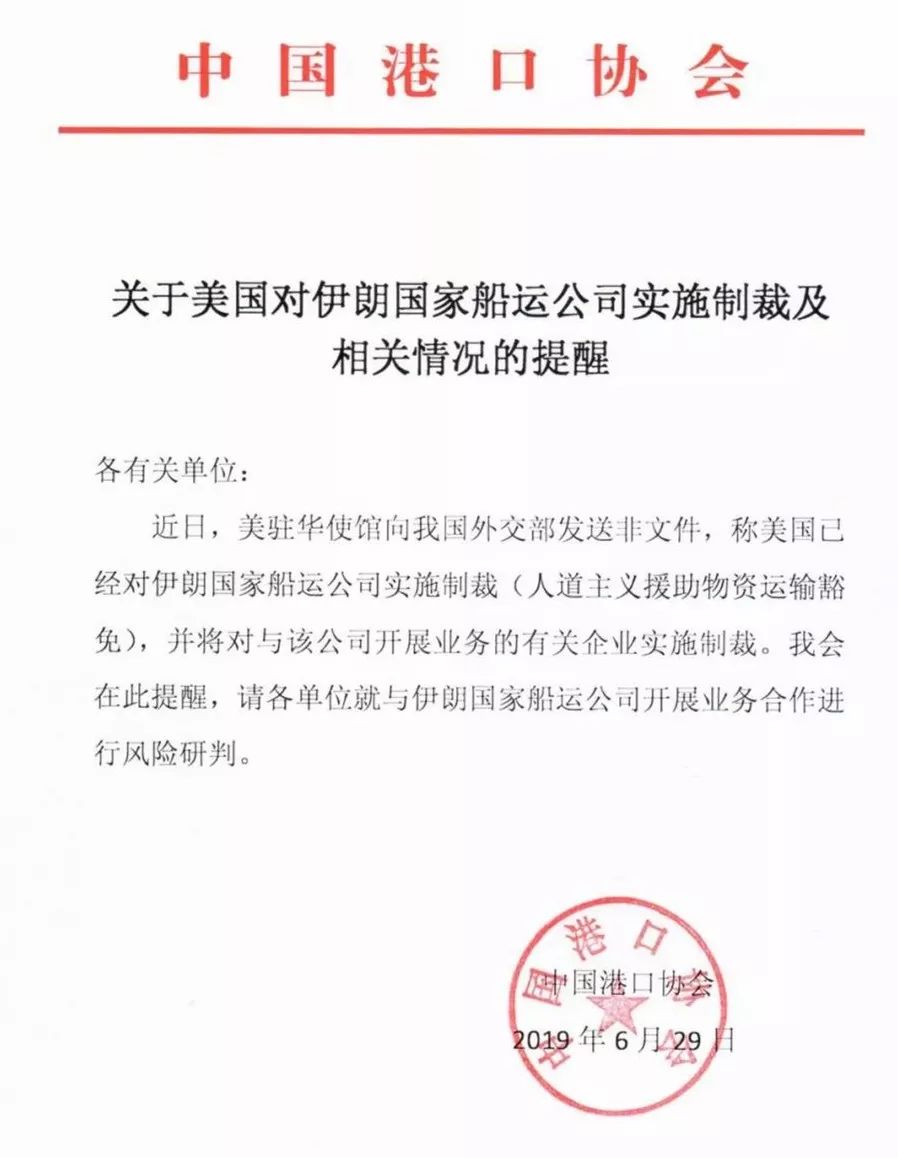 6月29日,中國(guó)港口協(xié)會(huì)發(fā)出關(guān)于美國(guó)對(duì)伊朗國(guó)家船運(yùn)公司實(shí)施制裁及相關(guān)情況的提醒。