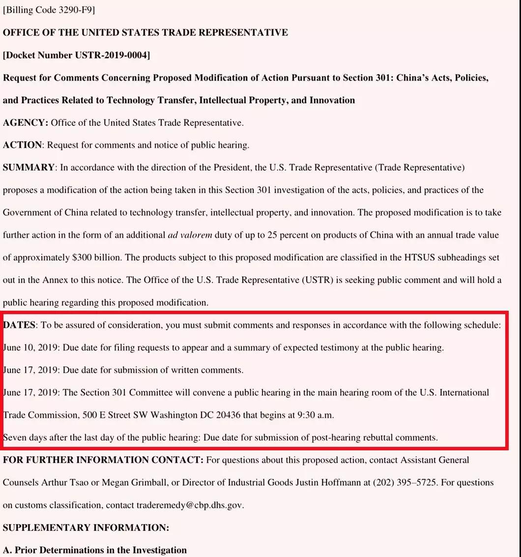 據(jù)悉USTR將于6月17日就這份清單舉行公開聽證會,并停止提交書面意見,USTR要求6月10日之前提交公開聽證會證據(jù)與材料,6月24日截止收集意見,征求意見的期限明顯短于以往對中國商品開征關(guān)稅的征求意見期限。并商討最終加征關(guān)稅清單和具體實施日期。