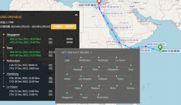 “One Orpheus”號(hào)是一艘服務(wù)于海洋網(wǎng)聯(lián)ONE亞洲至北美的FP1(Far East Pacific 1)航線的集裝箱船,事發(fā)時(shí)正執(zhí)行069W航次。涉及ANL、CMA CGM、COSCO SHIPPING、EVERGREEN、HAPAG-LLOYD、HMM、ONE、OOCL、YANG MING多家船公司共艙。
