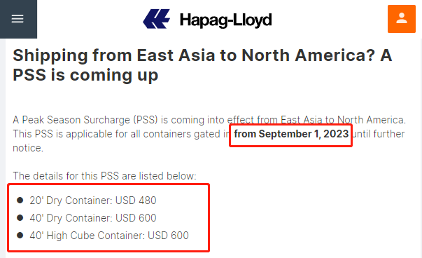 8日,赫伯羅特官網(wǎng)發(fā)布公告稱,自9月1日起,由東亞地區(qū)(包括中國)運(yùn)往北美的貨物征收旺季附加費(fèi)PSS(Peak Season Surcharge),PSS征收標(biāo)準(zhǔn):20尺柜:480美元,40尺及高柜600美元。