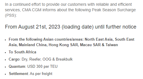 此前,達(dá)飛也曾宣布征收旺季附加費(fèi)!7月20日,達(dá)飛發(fā)布公告,稱自2023年8月21日(裝貨日期)起,對來自東北亞、東南亞、中國大陸、中國香港特別行政區(qū)和中國澳門特別行政區(qū)、中國臺(tái)灣地區(qū)前往南非的干箱、冷藏箱、超重貨物和散雜貨,每TEU征收300美元。
