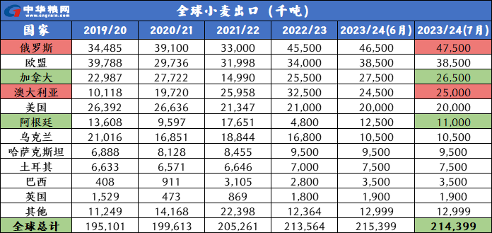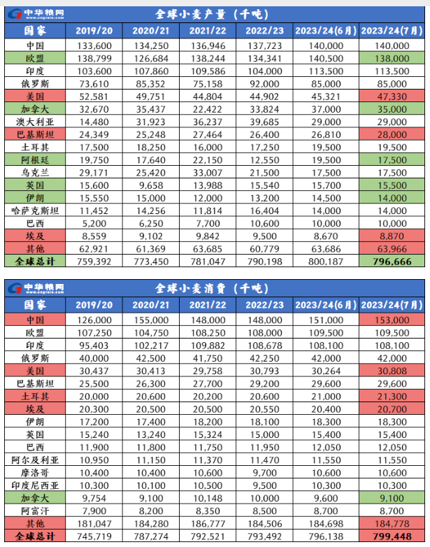 產量下調: 由于歐盟、加拿大等國的產量下降,2023/24年度全球小麥產量下調352萬噸,至7.97億噸。歐盟、阿根廷和加拿大的產量降幅超過美國和巴基斯坦的增幅。
