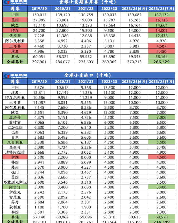 進口下調:2023/24年度全球小麥進口量2.14億噸,下調100萬噸。