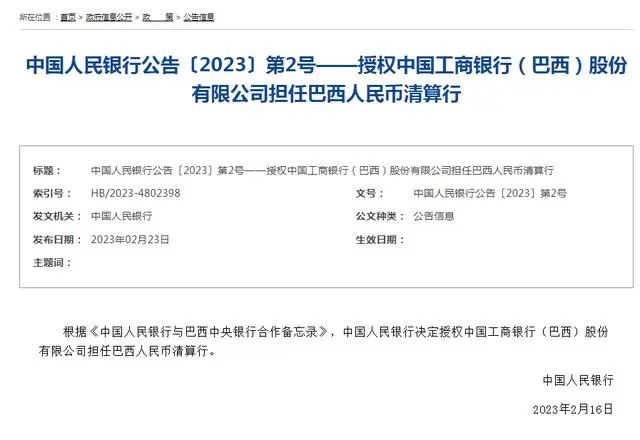今年年初,中國和巴西簽署了在巴西建立人民幣清算安排的合作備忘錄。2月23日,中國人民銀行發(fā)布公告,授權(quán)工銀巴西擔(dān)任巴西人民幣清算行。