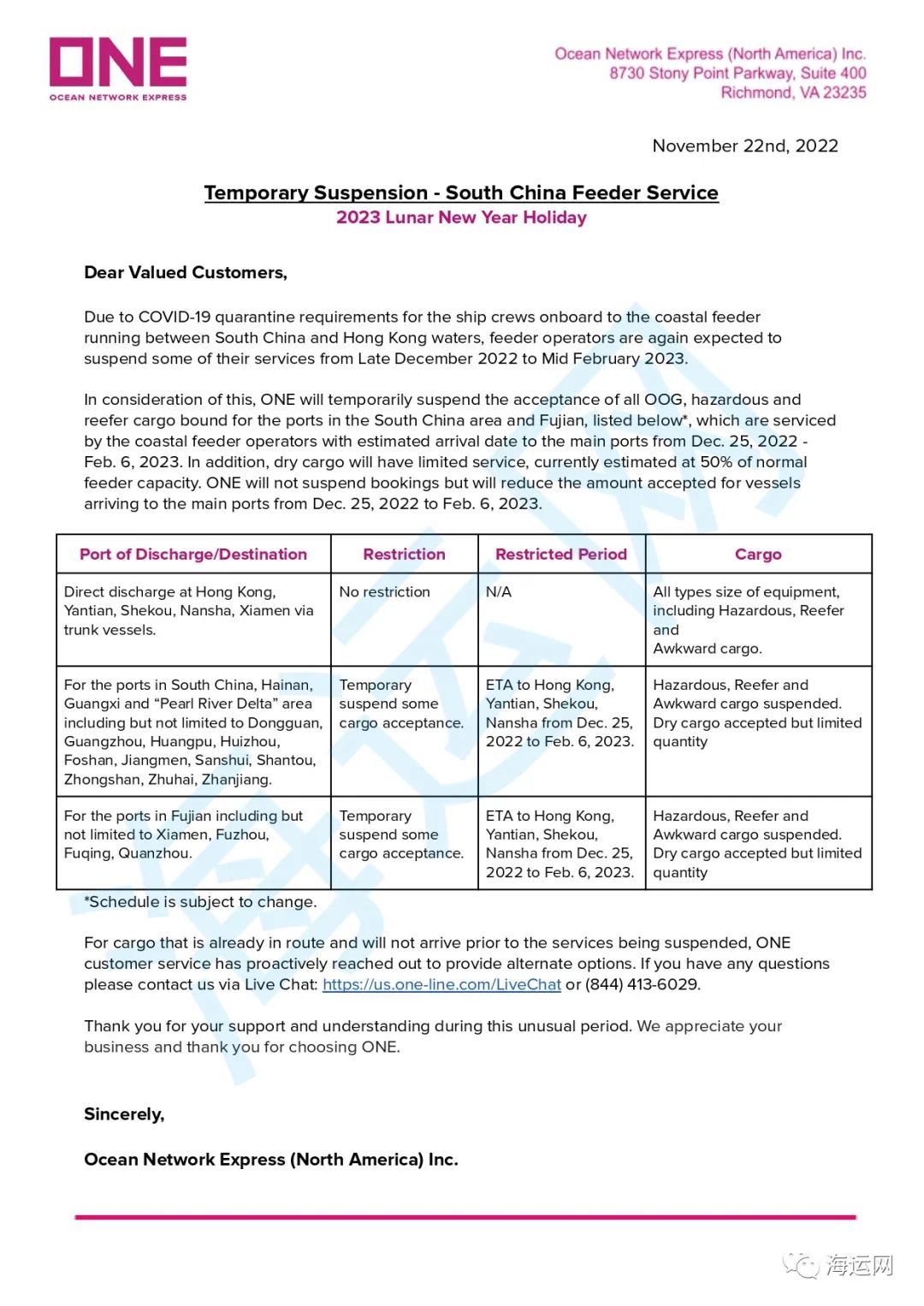 ONE發(fā)布通知稱,考慮到這種情況,將暫停接收所有開往華南地區(qū)和福建港口的OOG、危險(xiǎn)品箱、冷藏箱貨物(即由沿海支線運(yùn)營商提供服務(wù),預(yù)計(jì)到達(dá)主要港口的日期為2022年12月25日至2023年2月6日)。