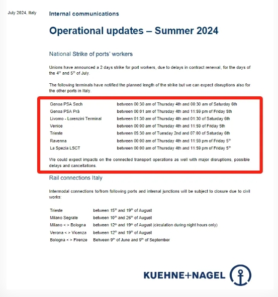 德迅在其官網(wǎng)發(fā)布提醒稱,代表港口工人的工會(huì)透露了有關(guān)意大利即將舉行的港口罷工的更多細(xì)節(jié)。此次罷工將于7月4日至5日舉行,將會(huì)造成運(yùn)輸中斷、擾亂港口運(yùn)營(yíng)并造成集裝箱裝卸延誤和取消。雖然一些碼頭已經(jīng)提供了具體罷工細(xì)節(jié),但預(yù)計(jì)其他港口也會(huì)出現(xiàn)運(yùn)營(yíng)中斷。