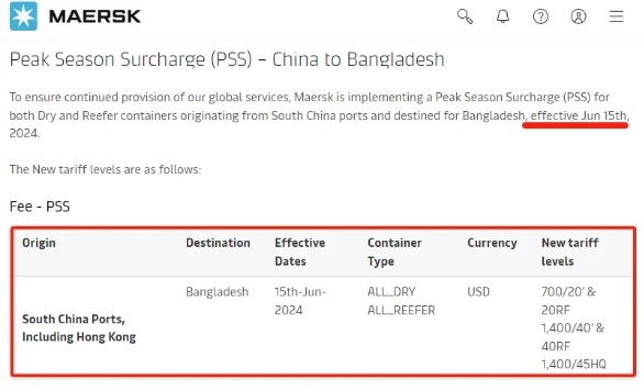 馬士基宣布,從2024年6月15日起對(duì)從華南港口出發(fā)前往孟加拉國(guó)的干貨集裝箱和冷藏集裝箱征收旺季附加費(fèi)(PSS),20尺干箱盒冷藏箱700美元,40尺干箱和冷藏箱及45尺HQ1400美元。詳情如下: