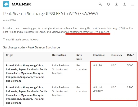 6月4日,馬士基宣布將從2024年6月17日起調(diào)整遠(yuǎn)東亞至印度、巴基斯坦、斯里蘭卡和馬爾代夫所有類型集裝箱的旺季附加費(fèi) (PSS)。具體收費(fèi)標(biāo)準(zhǔn)如下: