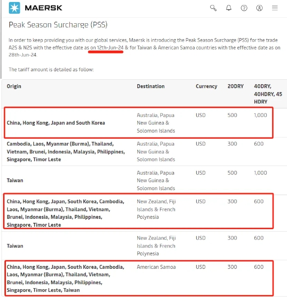 馬士基宣布,從6月12日起對(duì)中國(guó)至澳大利亞、巴布亞新幾內(nèi)亞和所羅門群島的A2S和N2S貿(mào)易航線征收旺季附加費(fèi)。具體收費(fèi)標(biāo)準(zhǔn)如下: