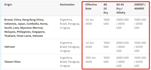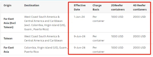 亞洲(不包括中國臺灣)至南美洲西海岸(不包括哥倫比亞、波多黎各、維爾京群島和關(guān)島),生效日期為2024年6月1日;